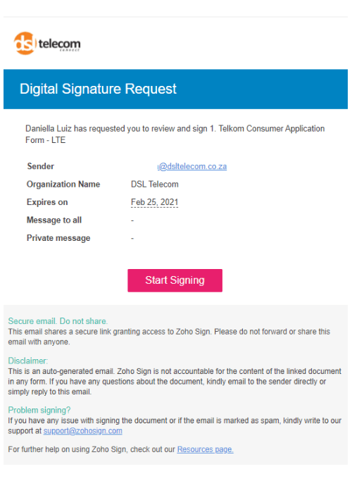 When DSL Telecom sends you a document via email, you can digitally sign this document, using an application called Zoho Sign. This email, also known as the Signature Request email, will contain a secure link to access the page where you can view and sign the documents. Follow these steps to learn how to easily sign DSL Telecom documents digitally.